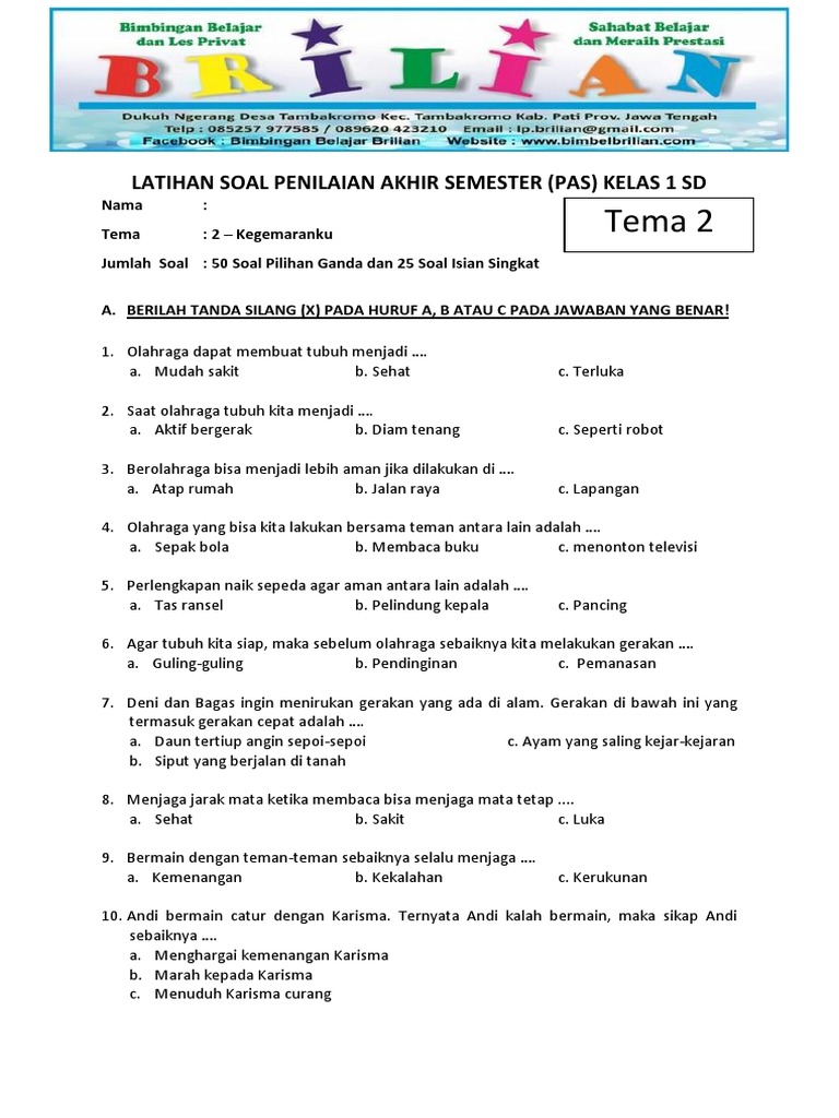 Semoga artikel ini bermanfaat dan memberikan gambaran yang komprehensif tentang contoh soal Tema 2 "Kegemaranku" untuk kelas 1 SD!